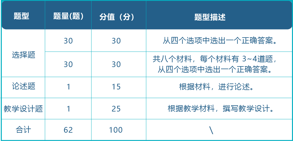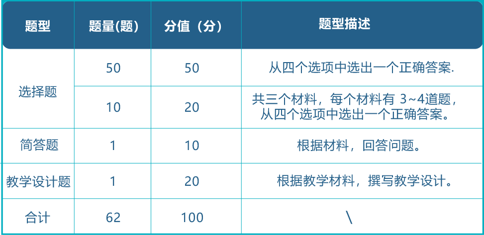 笔试综合考查专业理念、专业知识、专业技能、专业实践和专业发展五项能力,采用客观题和主观题相结合的考查方式,包括选择题、论述题和教学设计题三种题型。全卷共62题,满分100分,合格线60分,考试时间为120分钟。