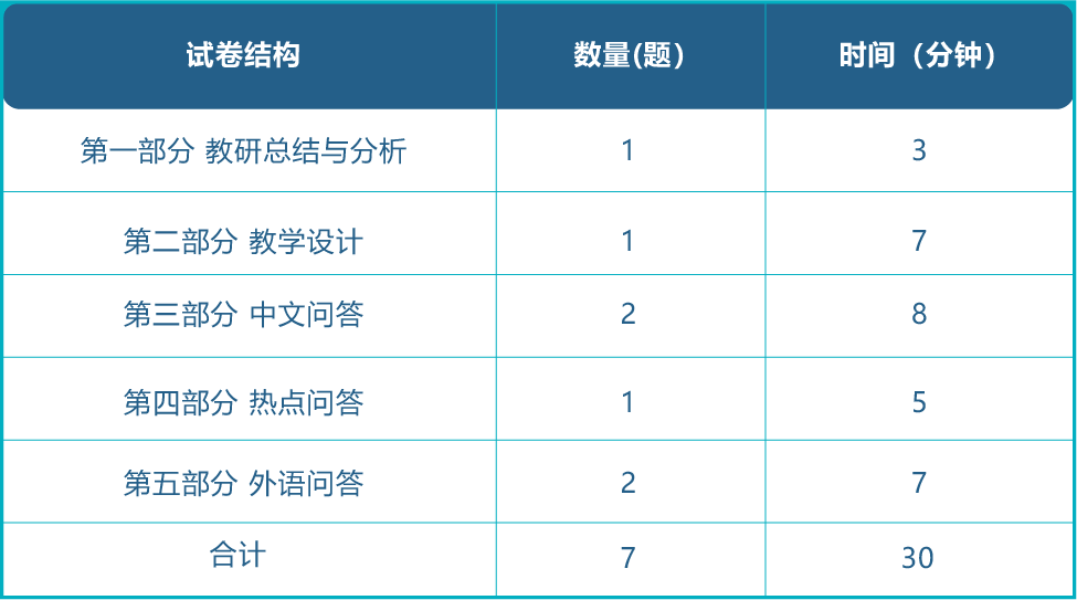 面试是对笔试成绩合格的考生进行考官小组面试,采用结构化面试和情景模拟相结合的方法,包括教研总结及反思、教学设计、中文问答、热点问答和外语问答五个部分。考官根据考生在面试过程中的表现进行综合评分,满分150分。其中,中文部分满分100分,外语部分满分50分。